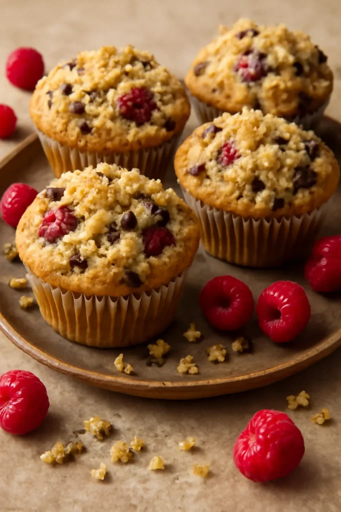 These muffins balance contrasts in the most satisfying way: the tartness of fresh raspberries against the creamy, comforting sweetness of chocolate chips; a soft, pillowy interior beneath a buttery, slightly crunchy crumble. Each bite offers textural variety—crumbly edges, a moist interior, and the occasional burst of fruit. The aroma while baking is evocative: warm butter, vanilla, and the faint citrus lift of lemon zest if you use it, making the kitchen feel cozy and inviting.